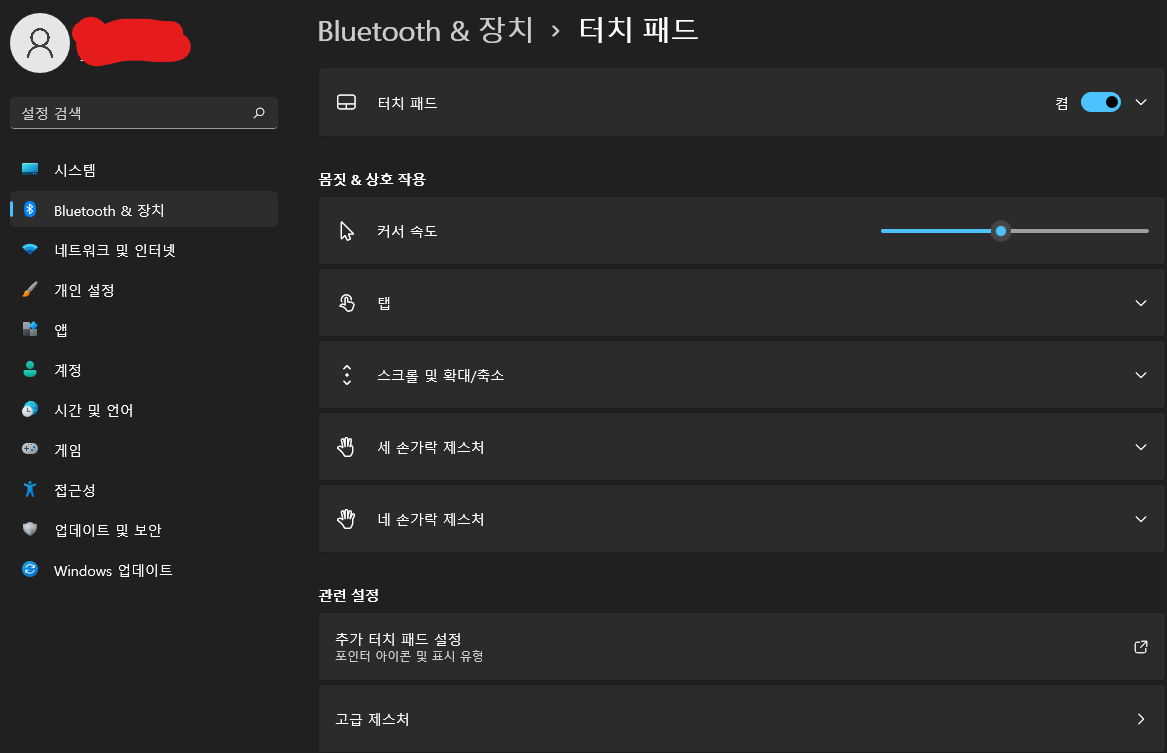 드라이버가 없어도 이동, 좌/우 클릭은 가능하지만 제스처가 안되는 것 같음, 설정에 트랙패드 설정도 없고