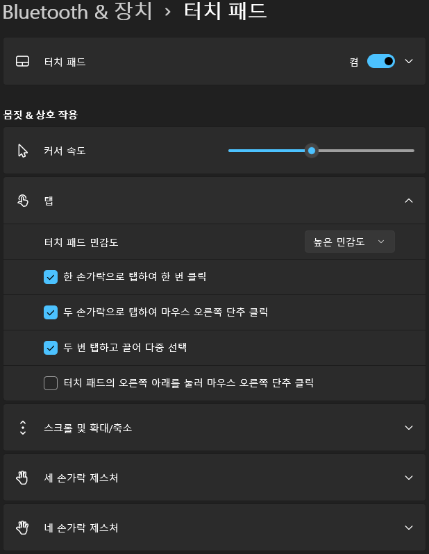 + 맥에서의 세 손가락 드래그는 윈도우 자체 설정에서 보지 못함